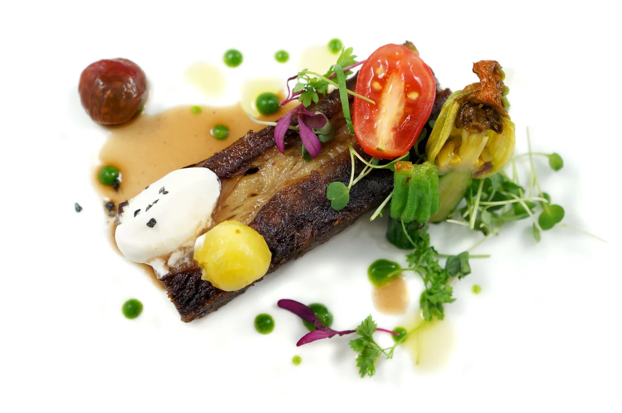 24-HOUR BEEF NAVEL & TOMATOESarugula puree - peeled tomatoes - licorice jus