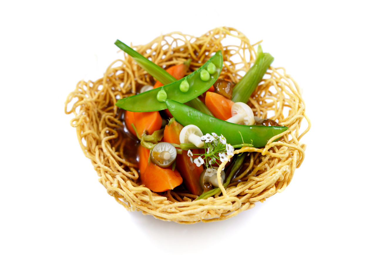 fried noodles - baby carrots - vegetable jus - beech mushrooms
