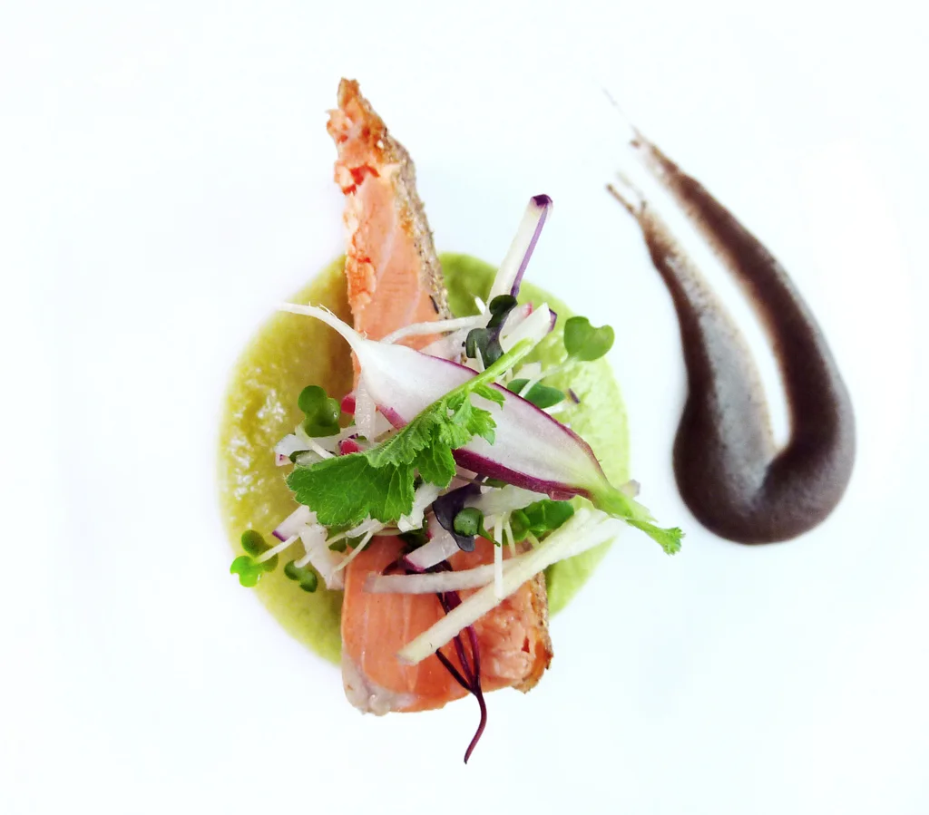 BLUECORN CRUSTED KING SALMONsalsa verde - black bean puree - radish & purple chayote salad