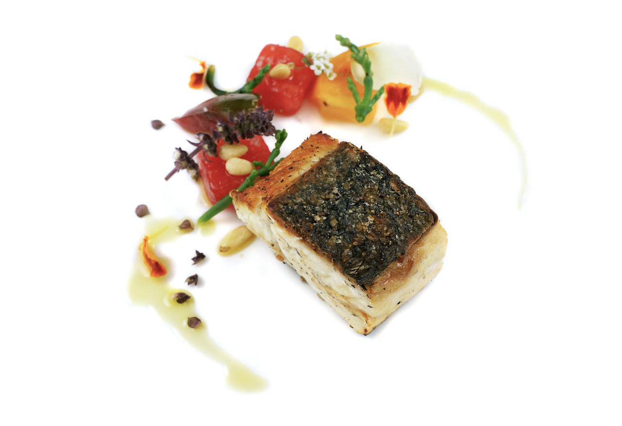 CALIFORNIA SEA BASSheirloom tomatoes - watermelon - pine nutsFrom Sous Chef Cecile Macasero.