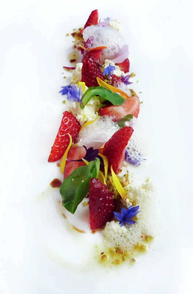 CHANDLER STRAWBERRY & WILDFLOWER SALADlavender foam - edible flowers - pistachios - saba