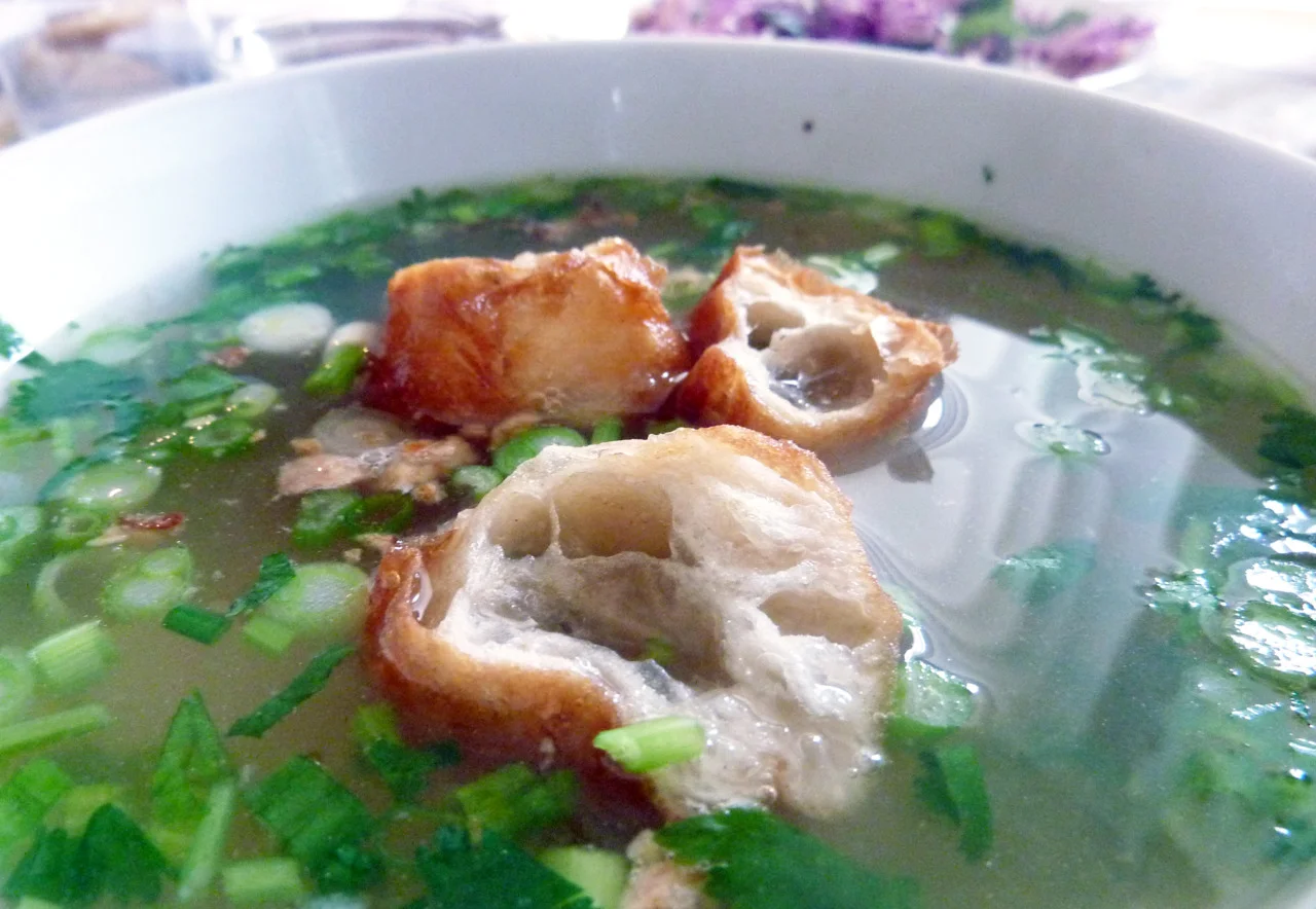 And there you have it. This is the ultimate soup and salad combo. So how do you eat it? Drop a couple chinese doughnuts into your soup at a time and let the outside get soft and eat it while it’s still crispy. Grab a chopstick full of the goi and dip it in the nuoc cham. Slurp some of the porridge to wash it all down. Repeat until bowl is empty.