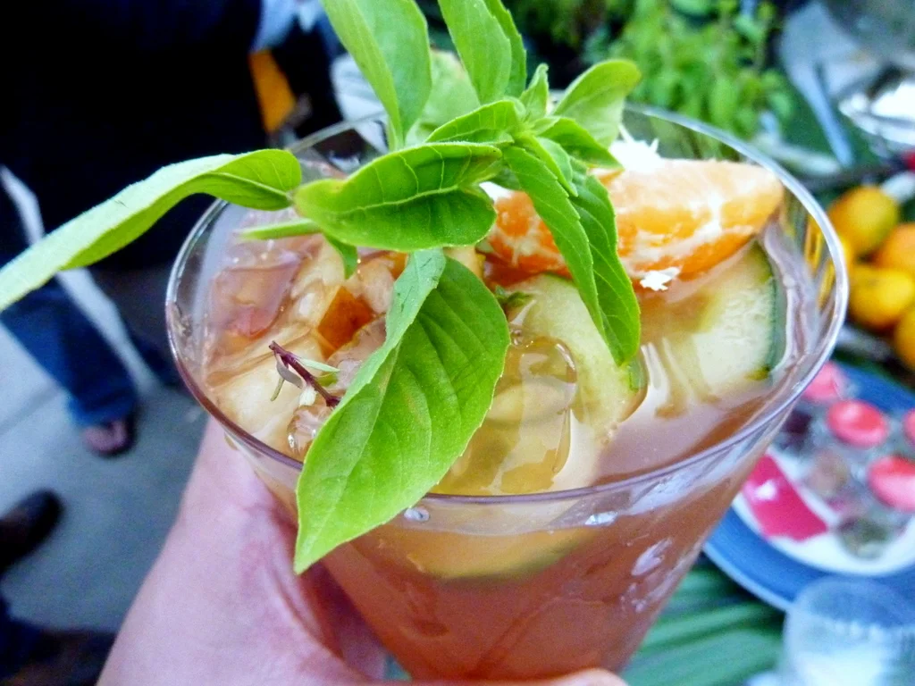 A spirited tea punch made from biodynamic rose petal chai tea, Hum Botanical Spirit, Death’s Door Organic Gin, Cresecent City Farmer’s Market cucumbers, Hollyfield Farm Tatsumas, Sweet Potato Syrup, PawPaws NOLA wildflower honey, Mayhaw-Jalapeno Gastrique