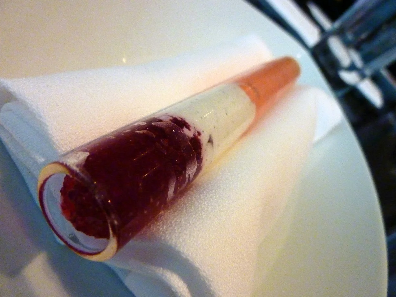 BUBBLEGUM STRAW. A giant straw layered with Balinese long pepper, hibiscus, and creme fraiche. Somehow, when slrupped all at once through the tube, these flavors tasted miraculously reminiscent of bubble gum. I’m not big on bubble-gum flavored food, but this was refined.