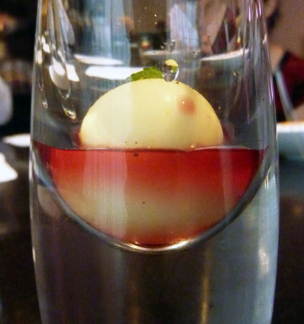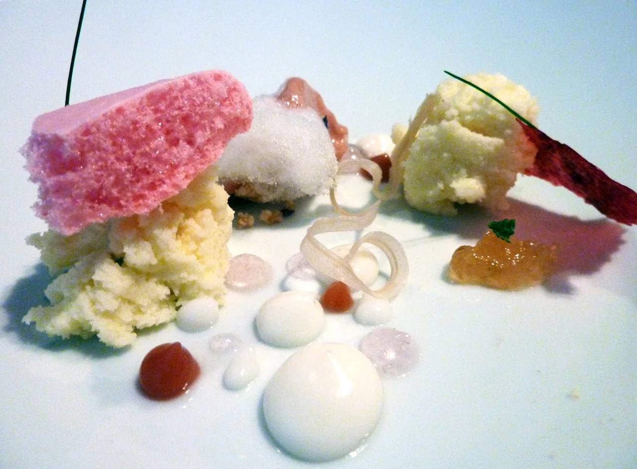 RHUBARB DESGUSTATION. Beautiful presentation; otherworldly. The plate arrived on a pillow injected with juniper air. As the plate sunk into the pillow, it deflated and released pure juniper aroma. My first thought was, ‘I need to get me one of these for home!’ My second thought was, ‘damn, this goat cheesecake is fuckin’ good.’