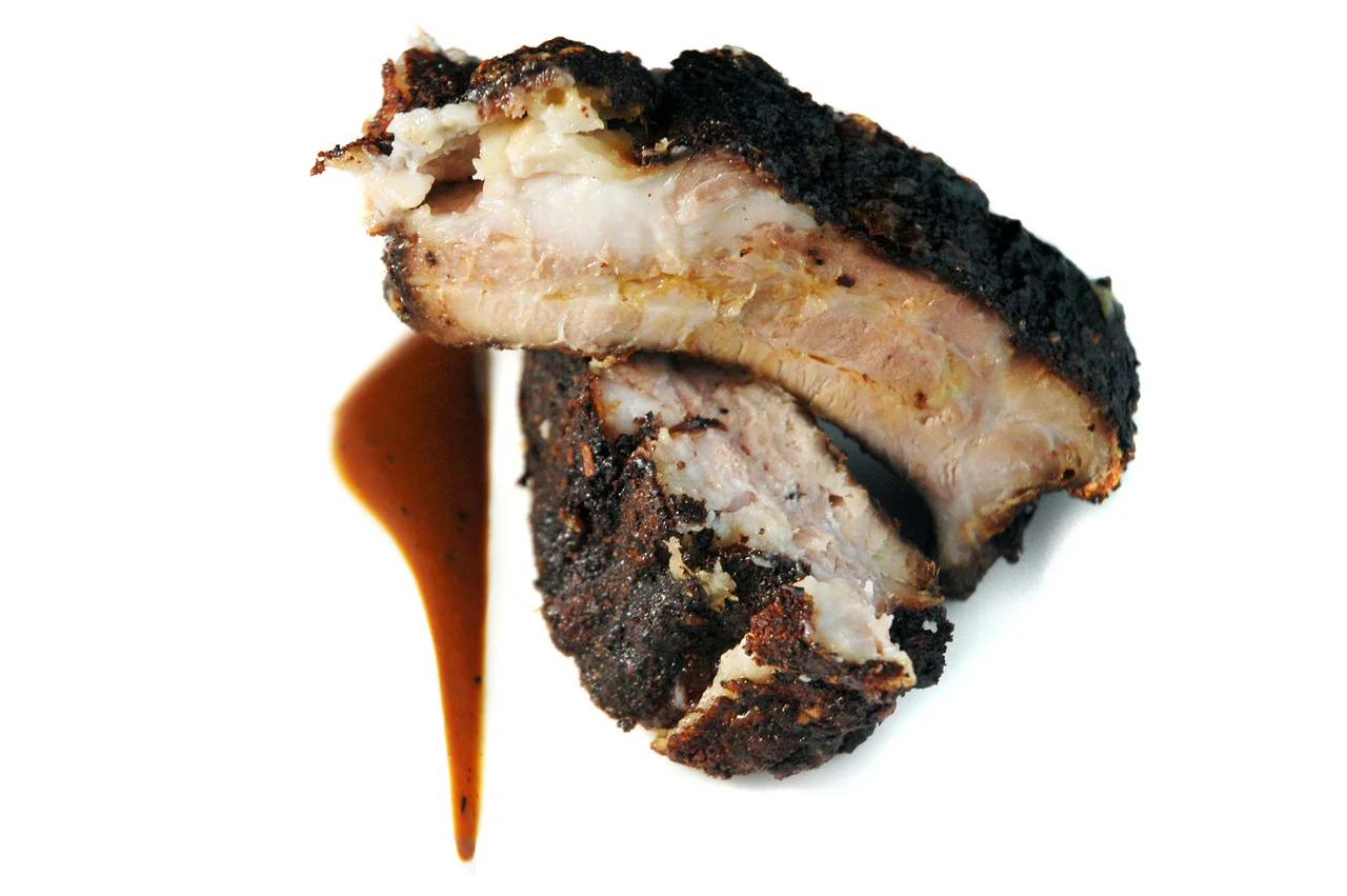 These ribs were rubbed with a coffee-spice rub consisting of ground coffee, garlic powder, onion powder, pepper, salt, brown sugar, cayenne, smoked paprika. You wanna cake this stuff on. I baked them at 185 F overnight on a sheet pan with pot of water placed on the rack underneath to bring a touch of moisture to the cooking environment. It should take anywhere from 6 to 8 hours. It won’t appear tender because the meat doesn’t fall right off the bone like a lot of Food Network enthusiasts insist should happen, but it is tender. The spices caked on from earlier create a very dry crust, or bark, keeping the immediate meat inside super moist and tender.