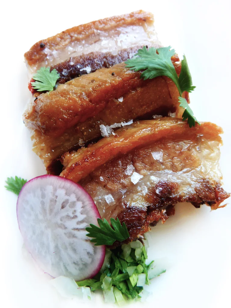 Slow-cooked, chilled, sliced, then rendered until golden. Crispy on the outside and delicately soft on the inside.