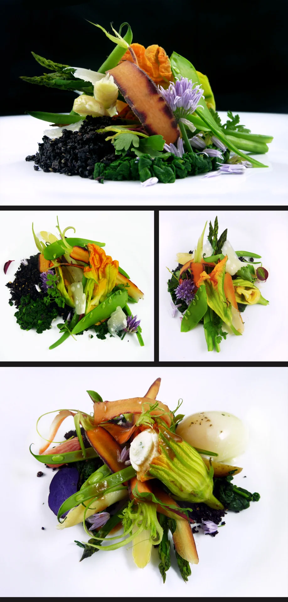 spring vegetables - truffled olive soil - jus vinaigrette - sous-vide egg - stuffed squash blossom