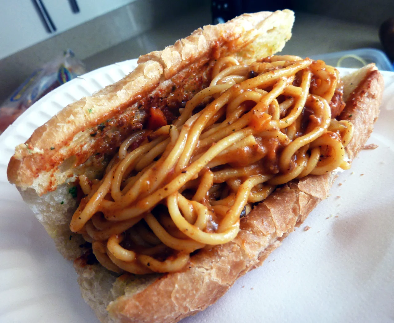 Crusty, garlic bread + spaghetti with chopped hot dogs. It’s nostalgic of those elementary school lunches where I’d stuff the shitty spaghetti into these small rubbery dinner rolls hoping the combination would somehow achieve greater results. IT DID.