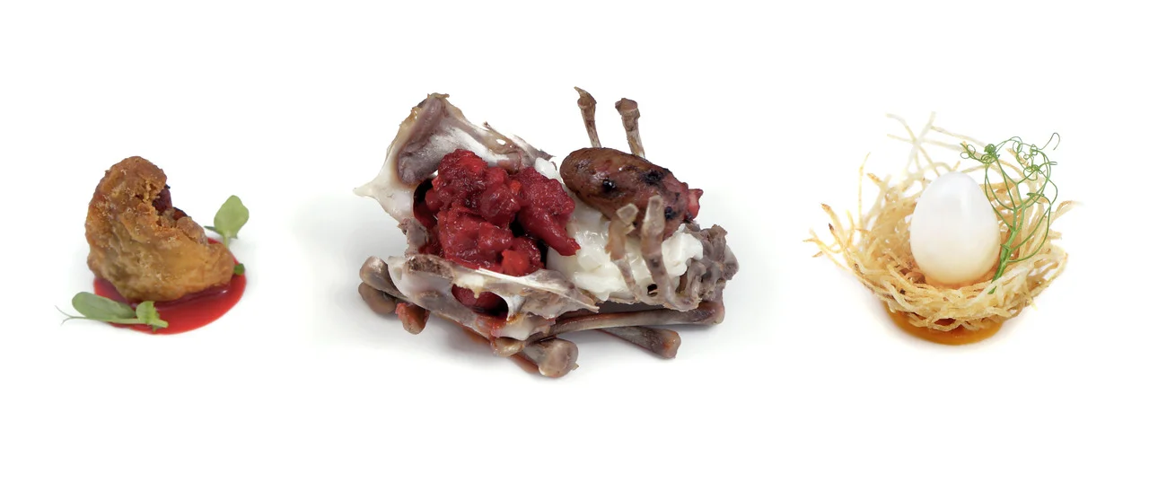 I used a needle syringe to inject the raw chicken heart with the chicken jus which I reduced, mounted with butter, and then dyed with beet juice. You can actually insert the needle right into the arterial tubes and it’ll pool up in a hollow area in the heart. Pretty awesome.