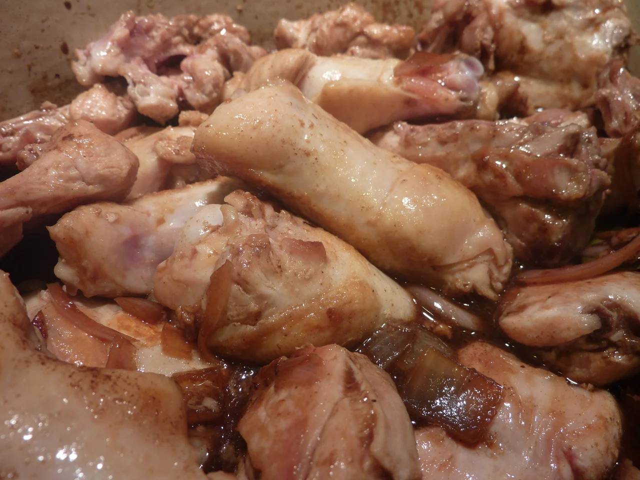 Marinate the rabbit and chicken with the soy sauce, balsamic vinegar, sesame oil, and oyster sauce overnight in a gallon-sized ziploc to ensure that the marinade coats the meat evenly. Note: marinating meat prior to making any type of stew is crucial in imparting flavor or else you might end up with a very flavorful liquid surrounding very unflavorful meat. Drain the meat from the marinade, saving the marinade. In a heated dutch oven, sear the meat in small batches on high. Remove the meat, reduce heat to medium, and add the onions. Cook until translucent. Deglaze with the fond with white wine and reduce au sec (until almost dry). Return the meat and marinade to the pan and add the remaining ingredients. When the liquid comes to a boil, remove the pan from the heat and park it in an oven at 300 degrees F uncovered for about 2 1/2 hours or until the meat is tender. Serve with steaming white rice.