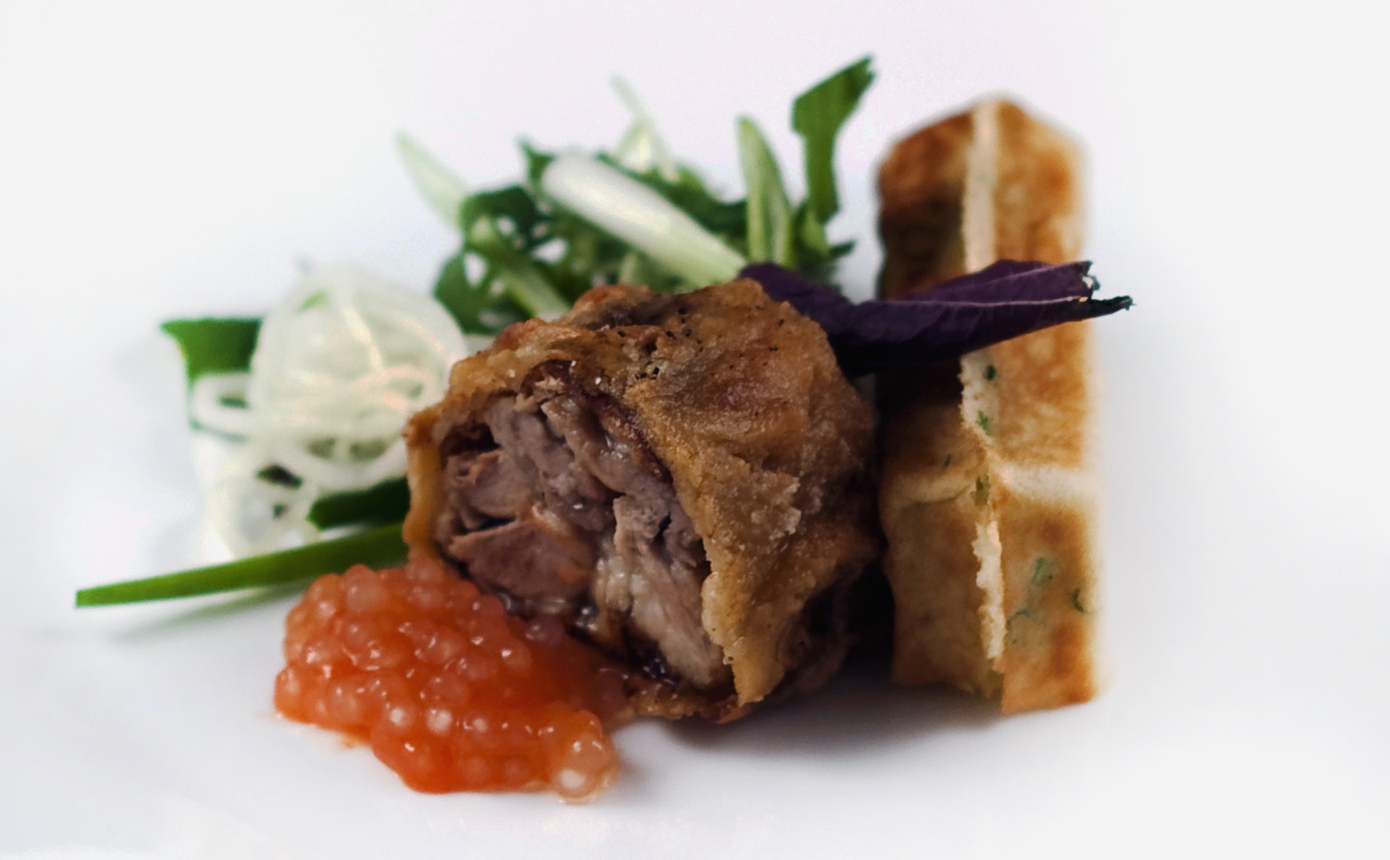 fried peking duck - tabasco caviar - apple noodles - herb salad - scallion waffle