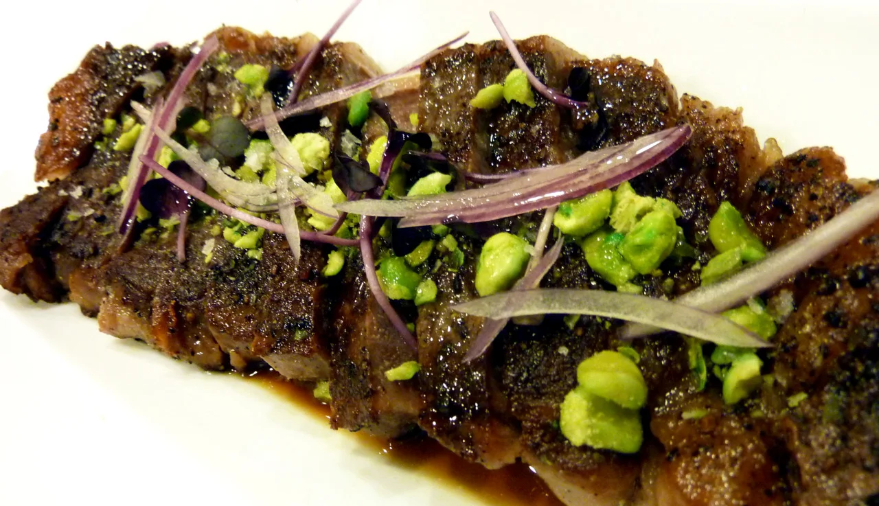 kobe steak & kasugai wasabi peaswith dashi demi & pickled onions