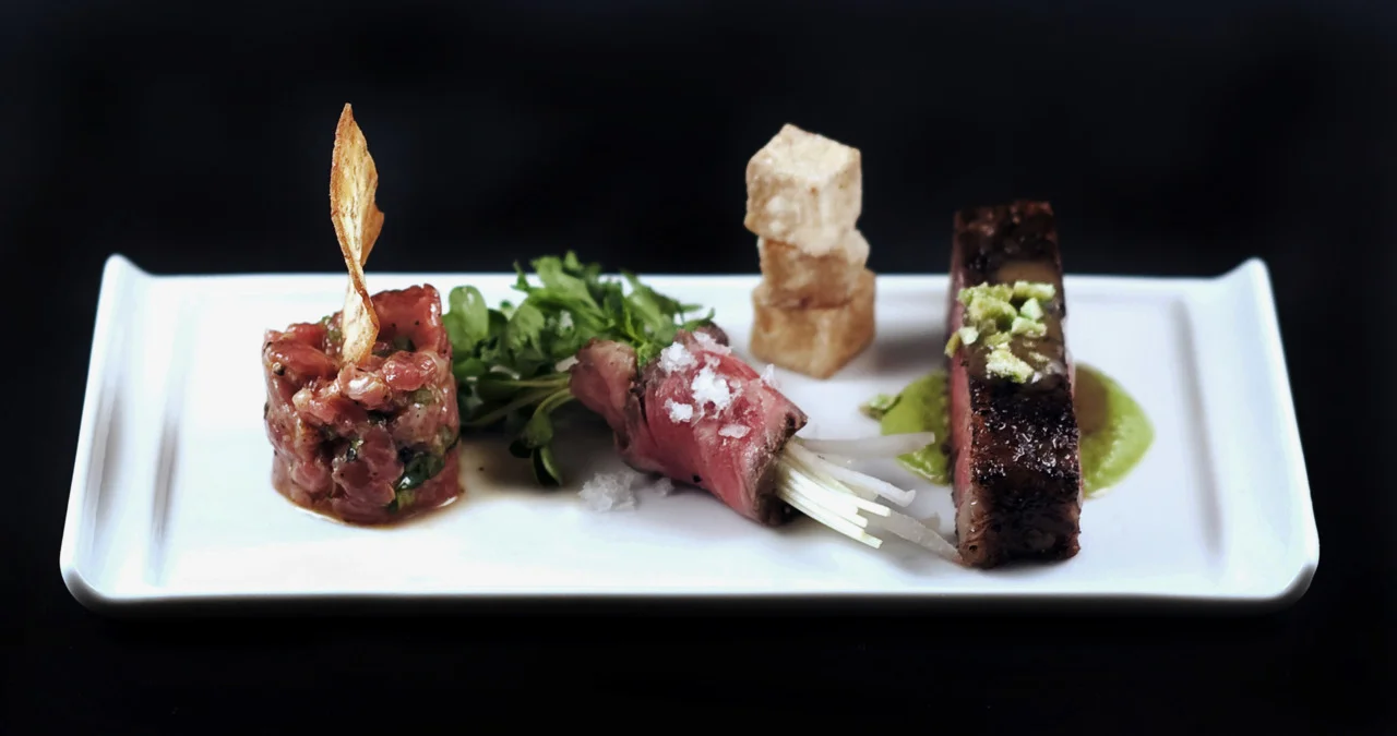 xo steak tartar with taro chip - beef tataki roll - steak ‘frites’ with dashi gravy & wasabi peas