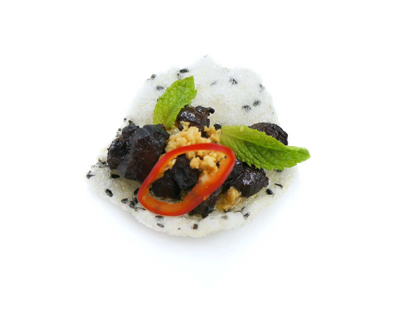LEMONGRASS BEEF TACOsesame rice cracker - peanuts - nuoc mam gel