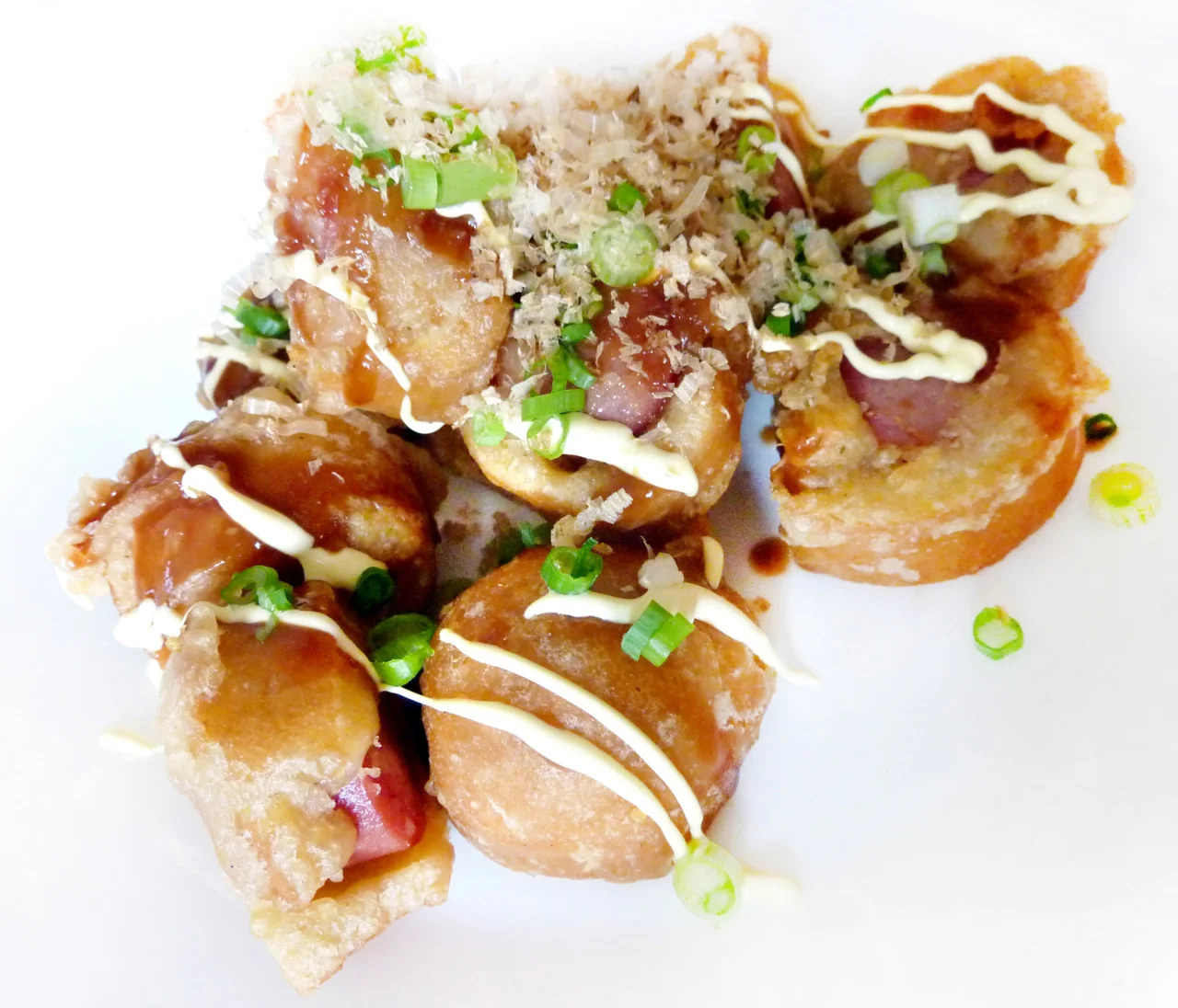 twice-fried corn dogs, bonito shavings, okonomiyaki batter, kewpie, okonomiyaki sauce