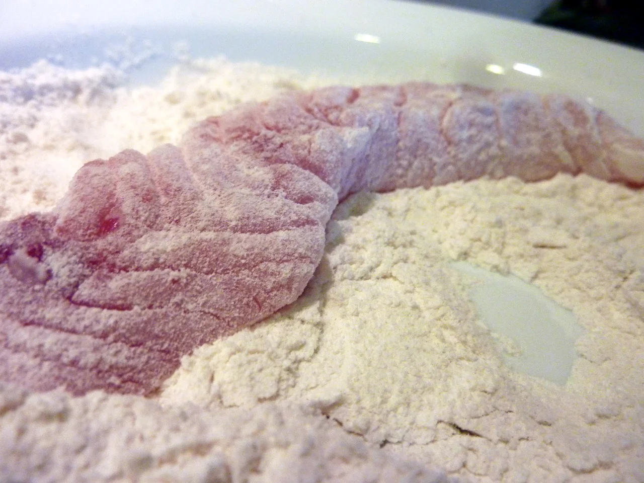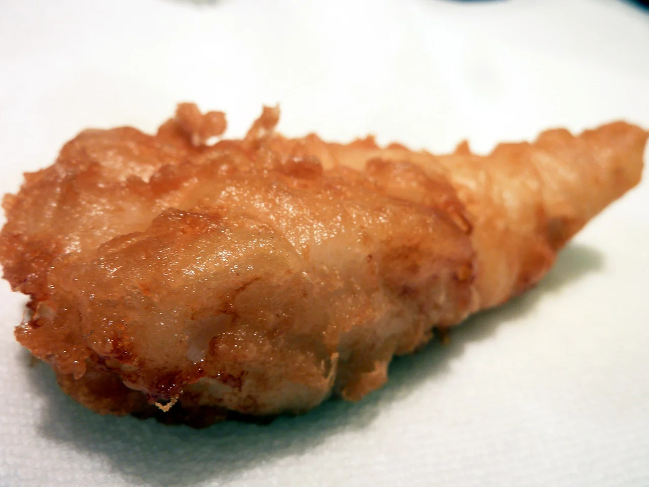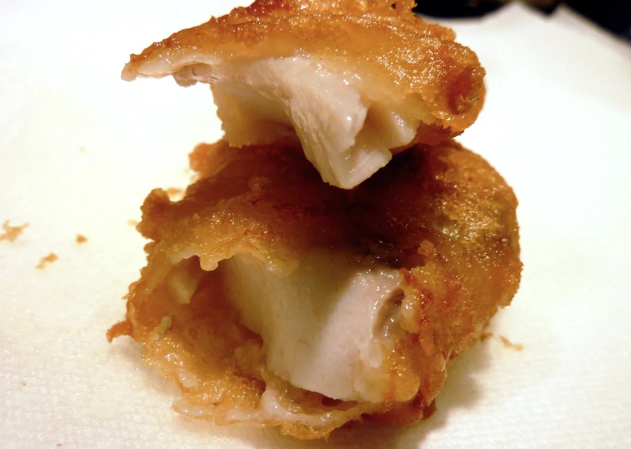 Although you can use just about any white fish to fry, I recommend Alaskan true cod. Catfish is very moist, but has a soggy texture; black cod is very buttery, but is too delicate; halibut has the best flavor, but is too expensive for this application. I used Pacific cod that I bought from a local store which I broke down into fillets and then strips.