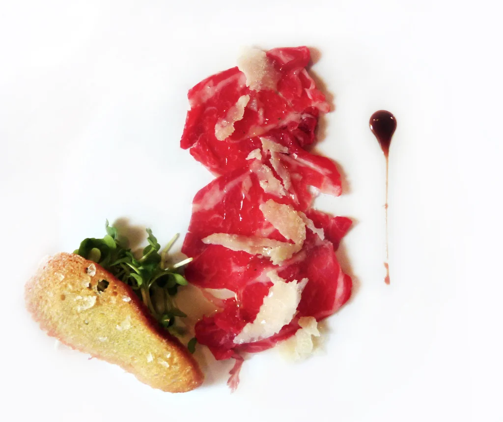 dry-aged marin sun farms beef, dijon microgreens with lemon oil, white truffle oil, black truffle salt, saba (aged balsamic), shaved parmesan