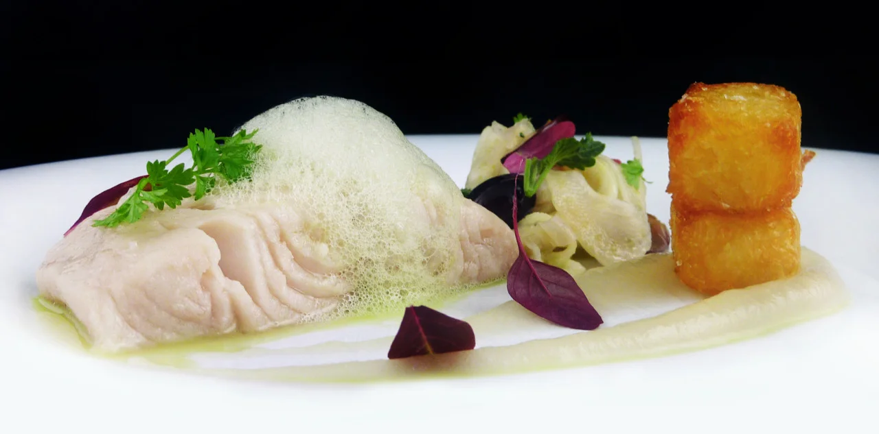asti marinated fennel & grapes - champagne gel - triple cooked potatoes - english pea foam