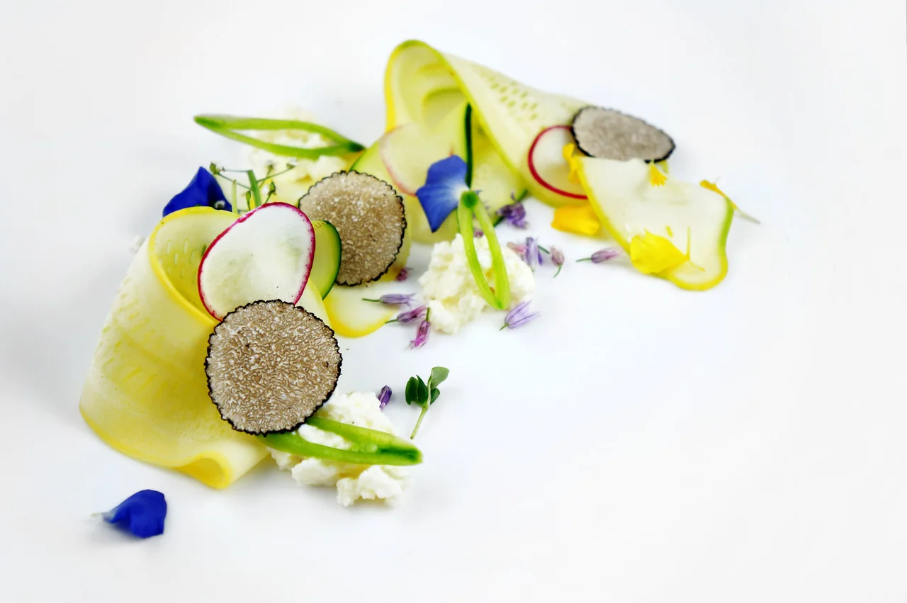 SHAVED SUMMER SQUASH SALADtruffles - bellwether ricotta - chive blossoms